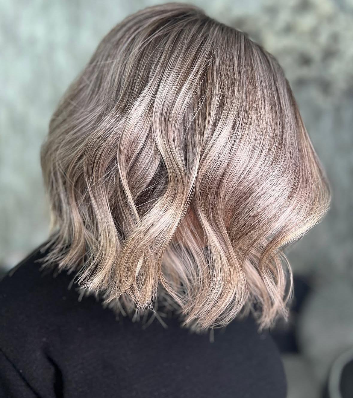 These images showcases a beautifully styled ash blonde bob with soft, wavy curls. The hair color features a sophisticated blend of cool, silvery tones that add depth and dimension, creating a chic and modern look.